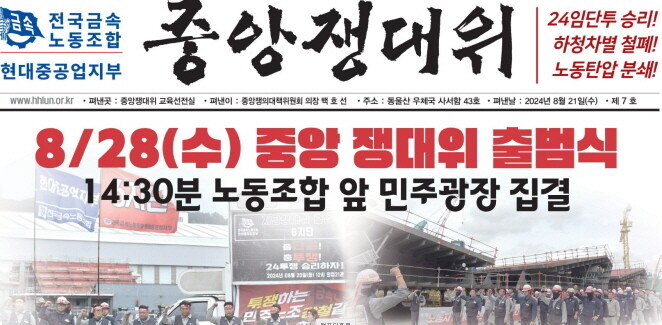 HD현대중 노조는 21일 소식지를 통해 "오는 28일 울산본사 민주광장에서 중앙쟁의대책위원회 출범식을 개최한다"고 선언했다.