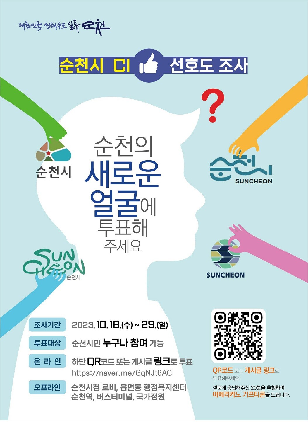 조사 참여는 온라인의 경우 시 누리집에 게시된 네이버 링크 접속 또는 QR코드를 통해 가능하며, 오프라인은 24개 읍면동 행정복지센터, 박람회장, 버스터미널, 순천역, 시청 로비에서도 투표할 수 있다.