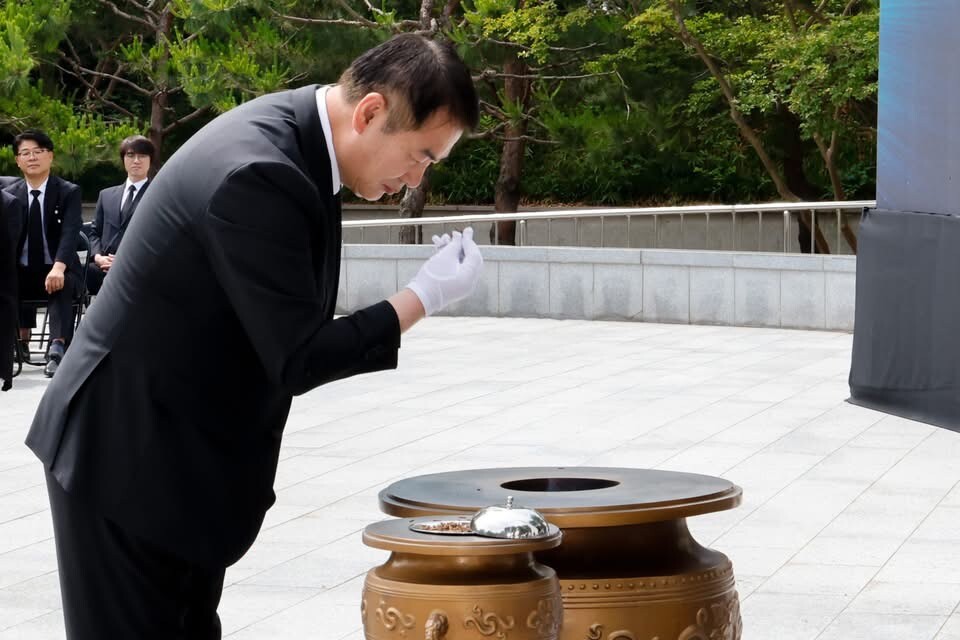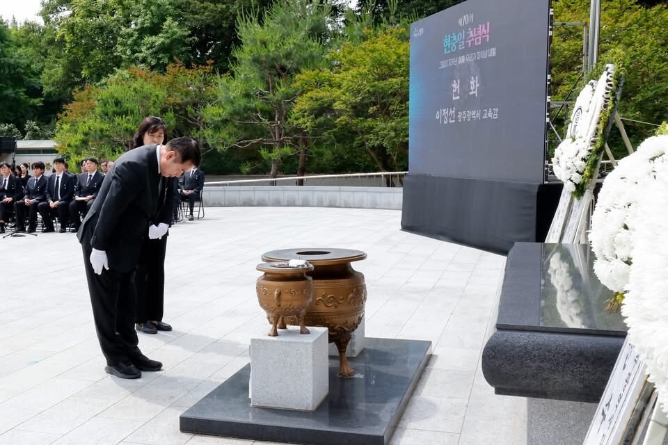 | ▲ 이정선 광주시교육감이 6일 제70회 현충일 추념식에 참석해 순국선열과 호국영령의 고귀한 뜻을 잊지 않겠다며 미래세대에게 온몸으로 지켜낸 국가의 소중함도 잘 교육하겠다고 다짐하고 있다. [페이스북 갈무리] |