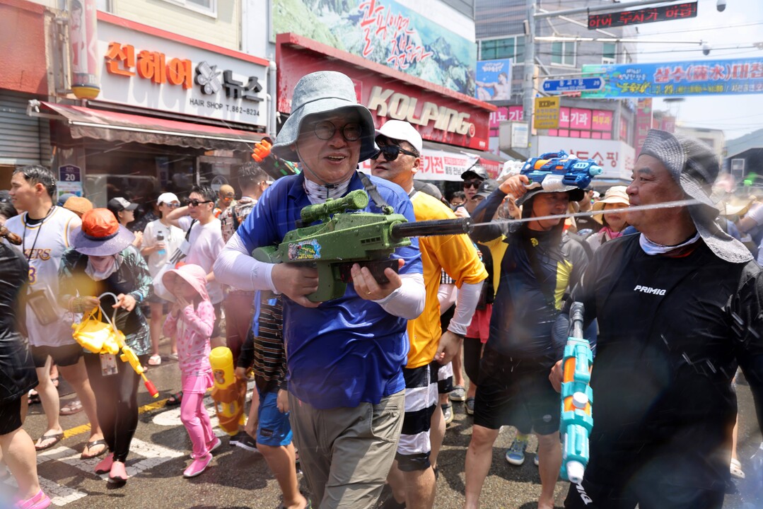 | ▲ 지난 7월 29일 김성 장흥군수가 살수대첩 거리 퍼레이드에 참석해 관광객들에게 물총을 쏘며 축제를 즐기고 있다. [장흥군 제공] |