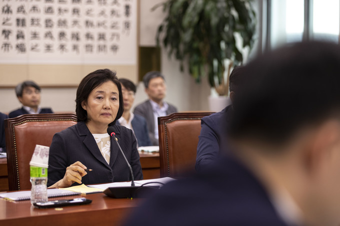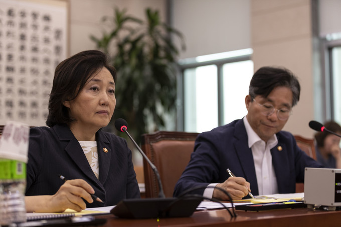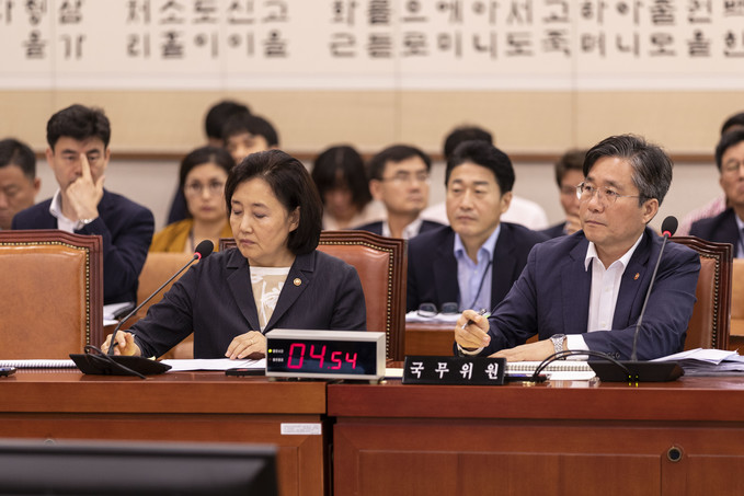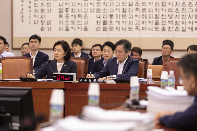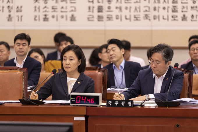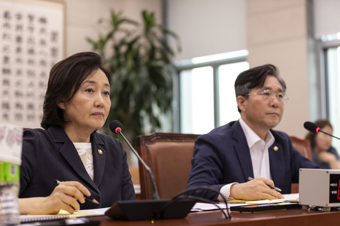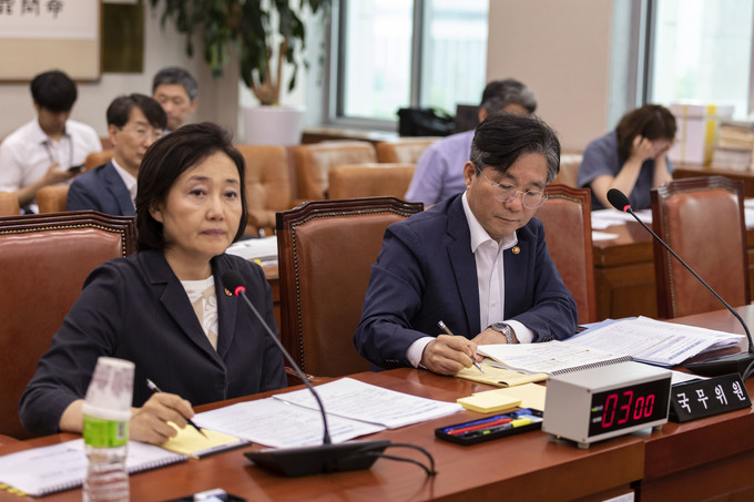 박영선 중소벤처기업부 장관(왼쪽), 성윤모 산업통상자원부 장관이 31일 오후 서울 여의도 국회에서 열린 법제사법위원회 전체회의에 출석해 의원 질의를 듣고 있다.