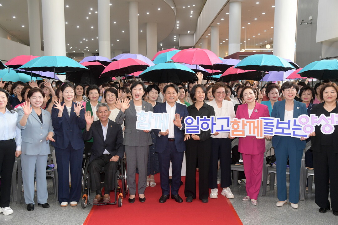 | ▲ 강기정 광주광역시장이 30일 오후 시청 시민홀에서 열린 양성평등주간 기념행사에 참석하여 참석자들과 함께 양성평등 우산 퍼포먼스를 하고 있다. [광주광역시 제공] |