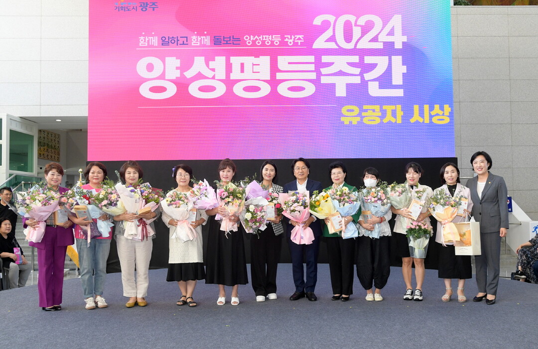 | ▲ 강기정 광주광역시장이 30일 오후 시청 시민홀에서 열린 양성평등주간 기념행사에 참석하여 유공자 시상을 한 후 수상자들과 함께 기념촬영을 하고 있다. [광주광역시 제공] |