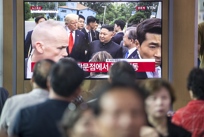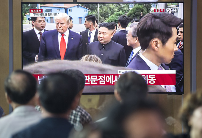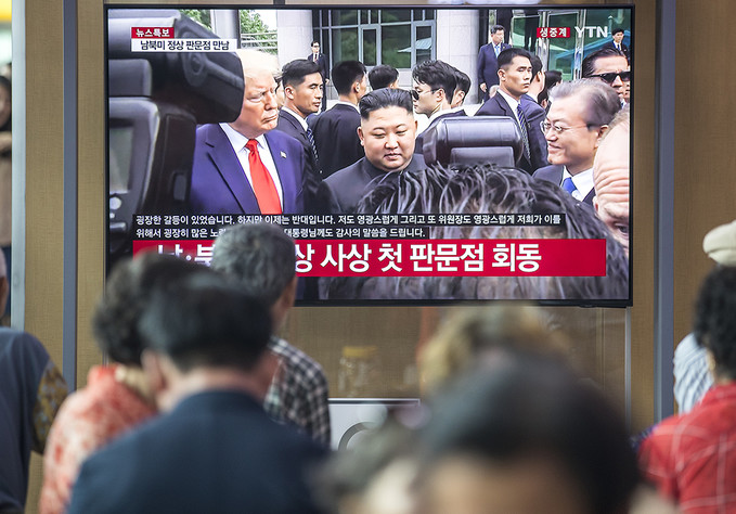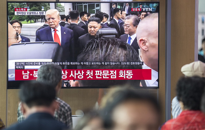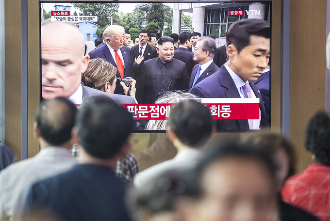 30일 오후 서울 용산구 서울역 대합실에서 TV를 통해 시민들이 문재인 대통령과 도널드 트럼프 미국 대통령, 김정은 북한 국무위원장이 만나는 모습을 보고 있다.