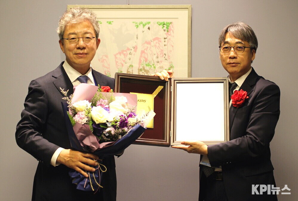 | ▲ 이형락(오른쪽) UPA 부사장이 서비스경영학회 최정일 회장으로부터 상장을 전달받고 있다. [울산항만공사 제공] |