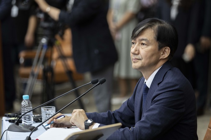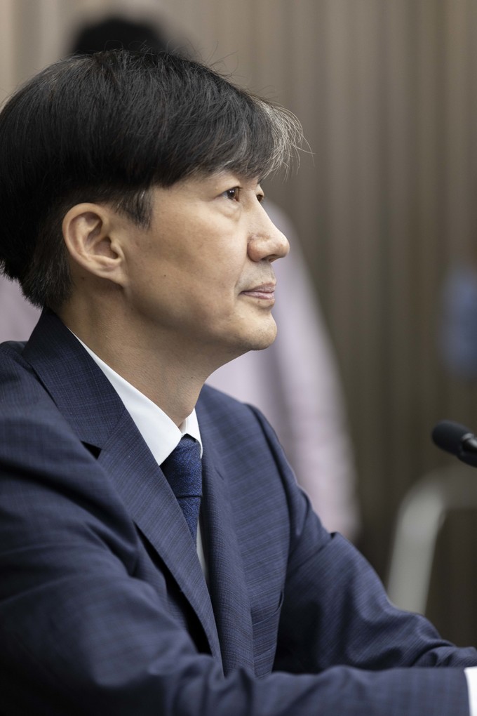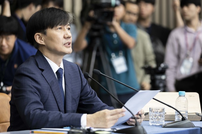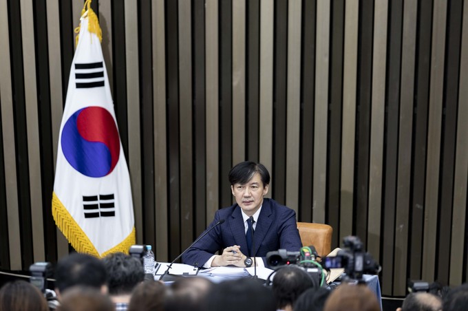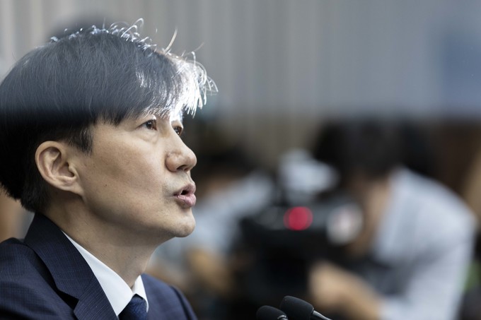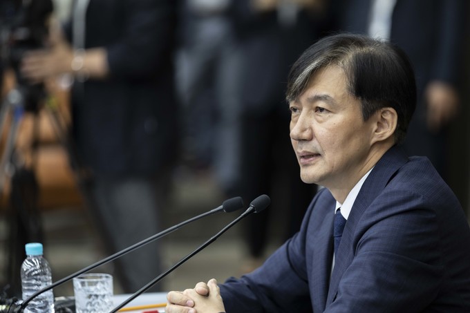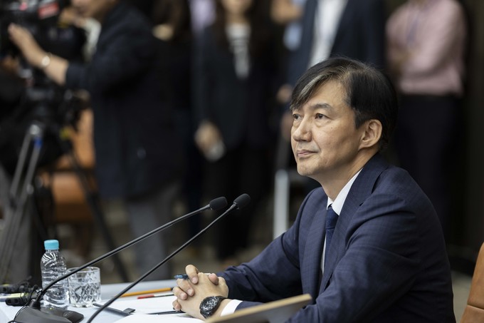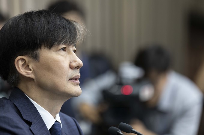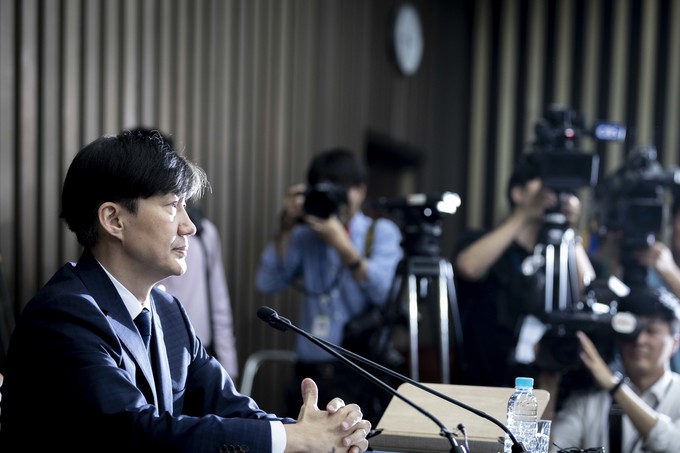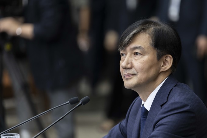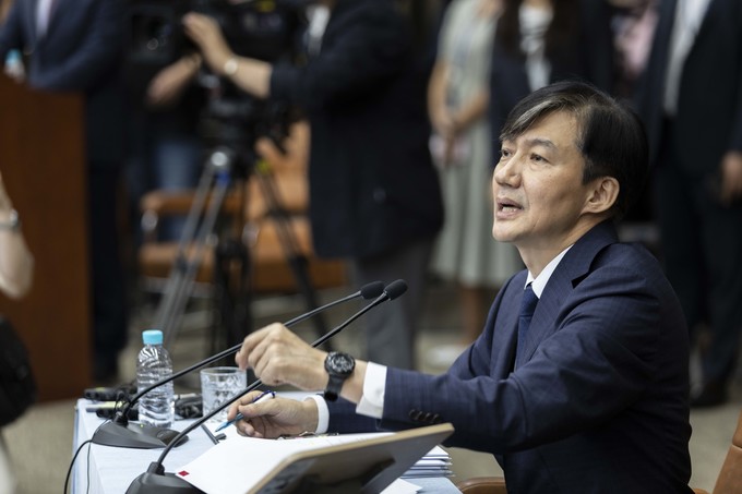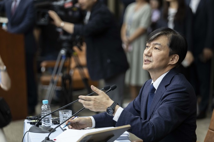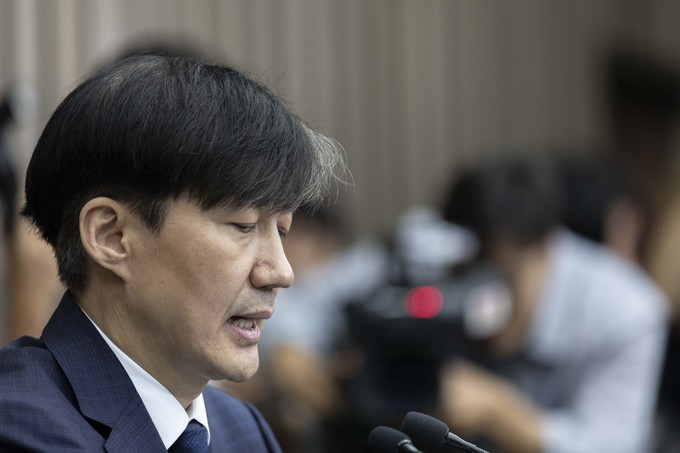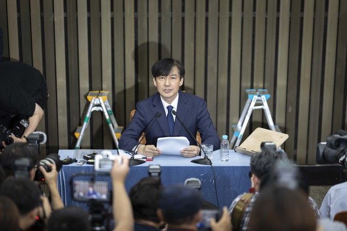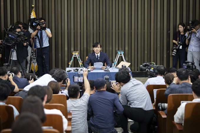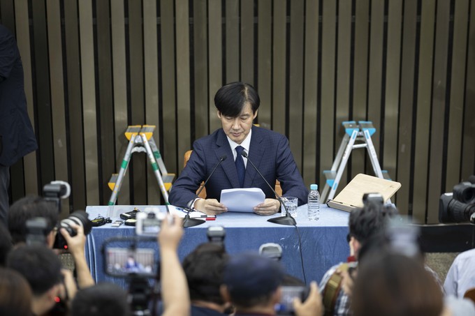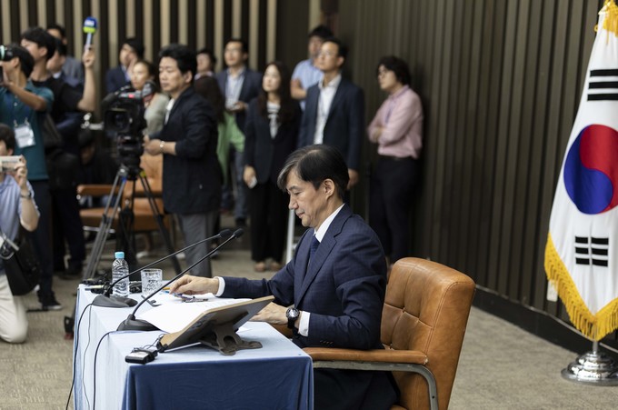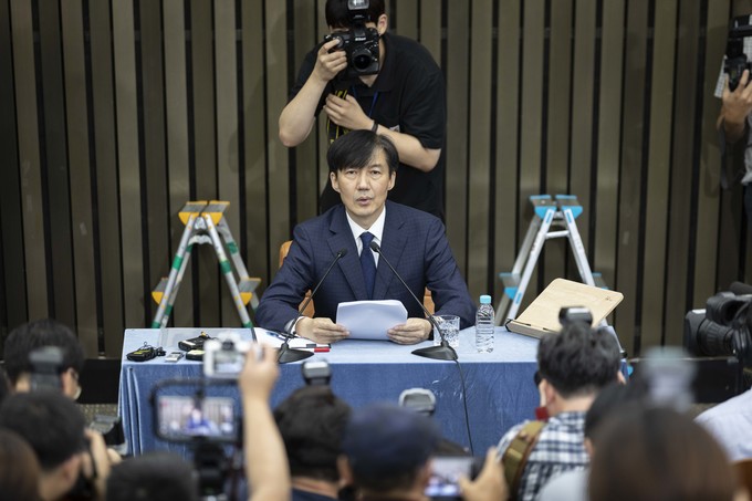 조국 법무부 장관 후보자가 2일 오후 서울 여의도 국회에서 기자회견을 하고 있다.