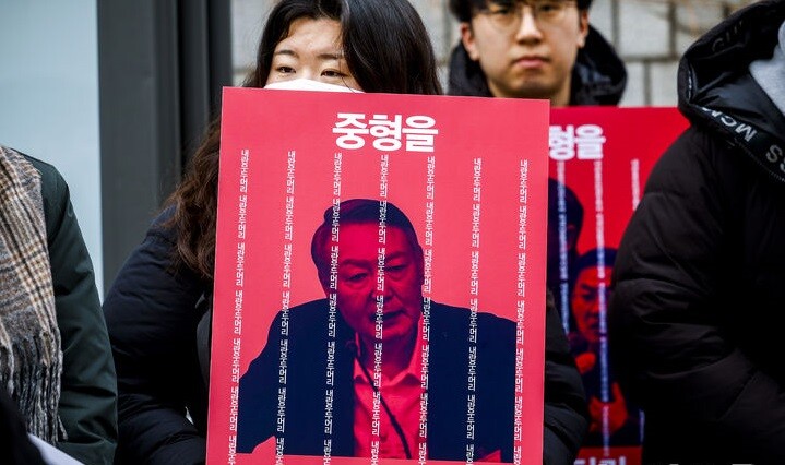 | ▲ 15일 서울 서초구 서울중앙지방법원 앞에서 열린 윤석열 중형 촉구 서명 및 의견서 제출 기자회견 현장. 참여연대 및 민주사회를위한변호사모임 관계자들이 피켓시위를 하고 있다. [뉴시스] |