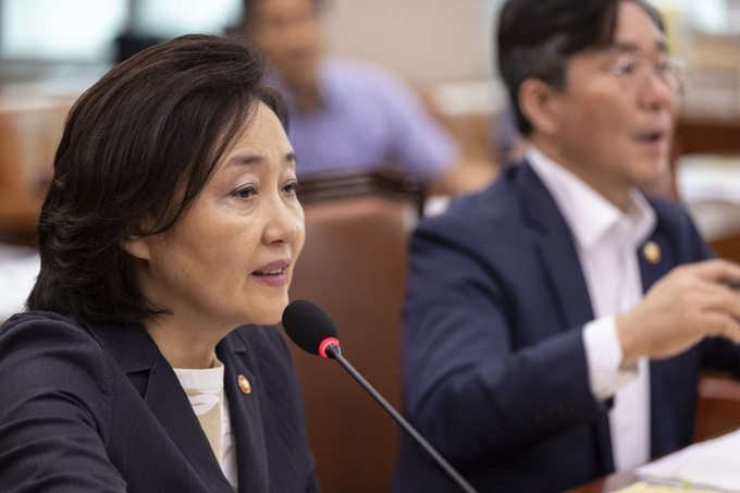 박영선 중소벤처기업부 장관(왼쪽)이 31일 오후 서울 여의도 국회에서 열린 법제사법위원회 전체회의에 출석해 의원 질의에 답하고 있다.