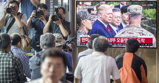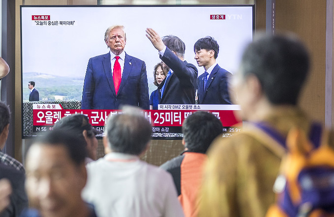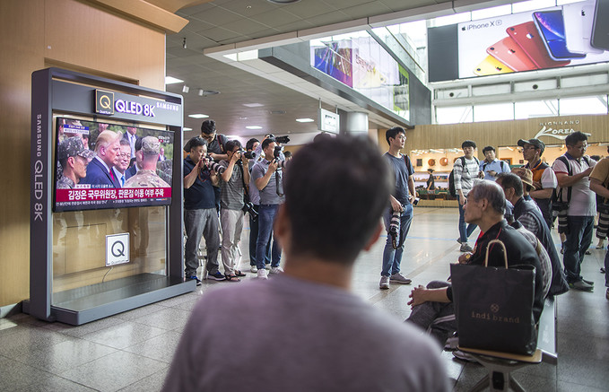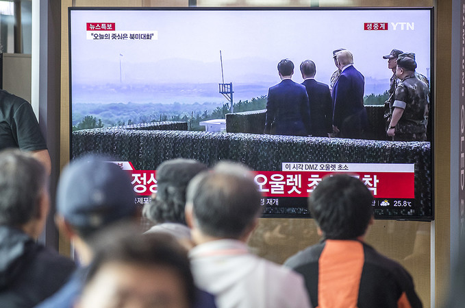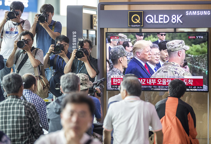 30일 오후 서울 용산구 서울역 대합실에서 TV를 통해 시민들이 문재인 대통령과 도널드 트럼프 미국 대통령이 오울렛 초소 전망대 북녘땅을 살피고 모습을 지켜보고 있다.