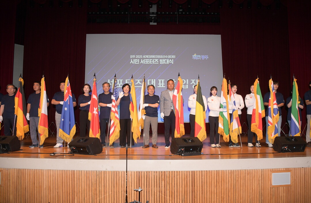 | ▲ 강기정 광주광역시장이 22일 오후 시청 대회의실에서 열린 '광주 2025 세계양궁선수권대회 시민 서포터즈 발대식'에 참석해 광주시양궁선수단과 함께 태극기 및 대회홍보기, 참여국가 국기 등을 들고 입장하고 있다. [광주광역시 제공] |