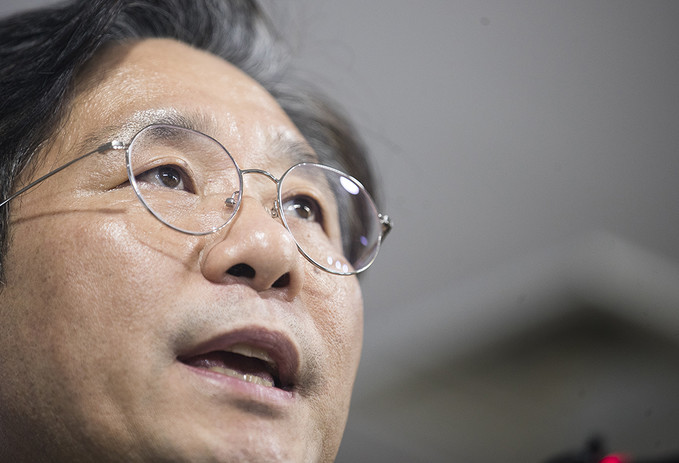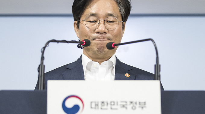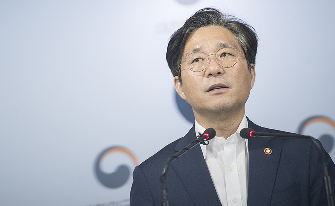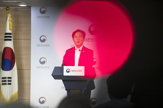 성윤모 산업통상자원부 장관이 9일 오후 서울 종로구 정부서울청사에서 일본 수출규제강화 조치 관련 브리핑을 하고 있다. 이날 성 장관은 일본이 제기한 불화수소 북한 반출 의혹에 대해 "일본은 근거 없는 주장을 즉시 중단하라"고 경고했다.