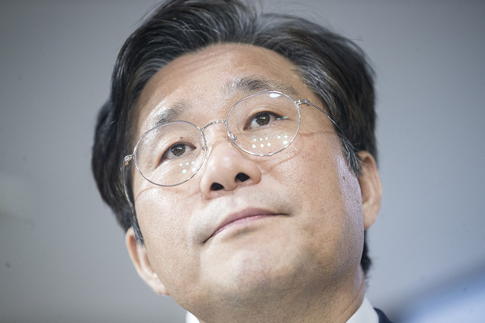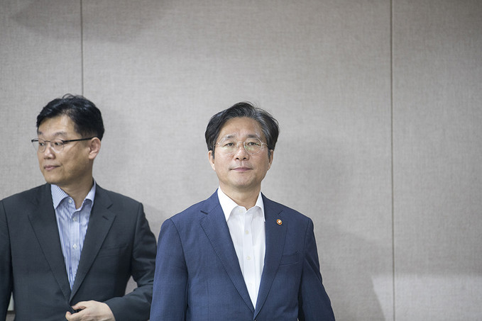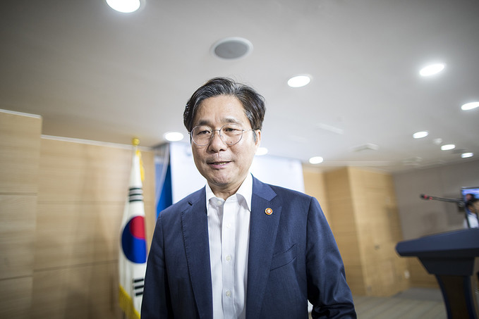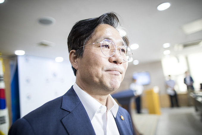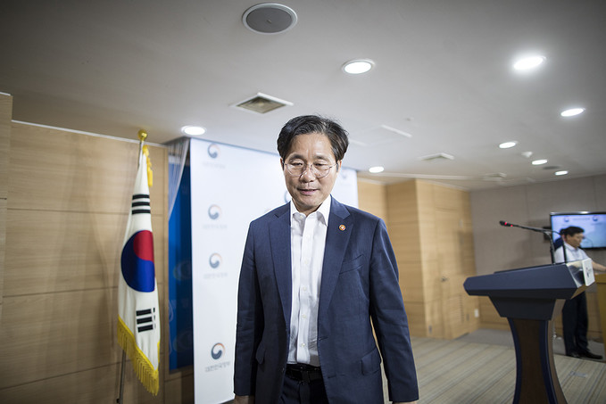 성윤모 산업통상자원부 장관이 9일 오후 서울 종로구 정부서울청사에서 일본 수출규제강화 조치 관련 브리핑을 마친 뒤 나가고 있다.