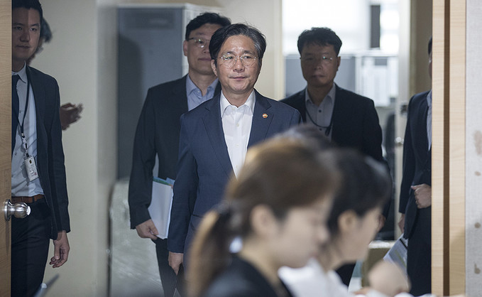성윤모 산업통상자원부 장관이 9일 오후 서울 종로구 정부서울청사에서 일본 수출규제강화 조치 관련 브리핑을 위해 들어오고 있다.