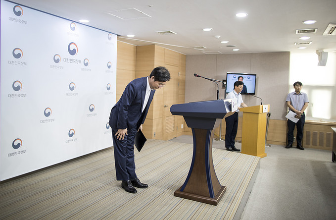 성윤모 산업통상자원부 장관이 9일 오후 서울 종로구 정부서울청사에서 일본 수출규제강화 조치 관련 브리핑을 마친 뒤 인사를 하고 있다.