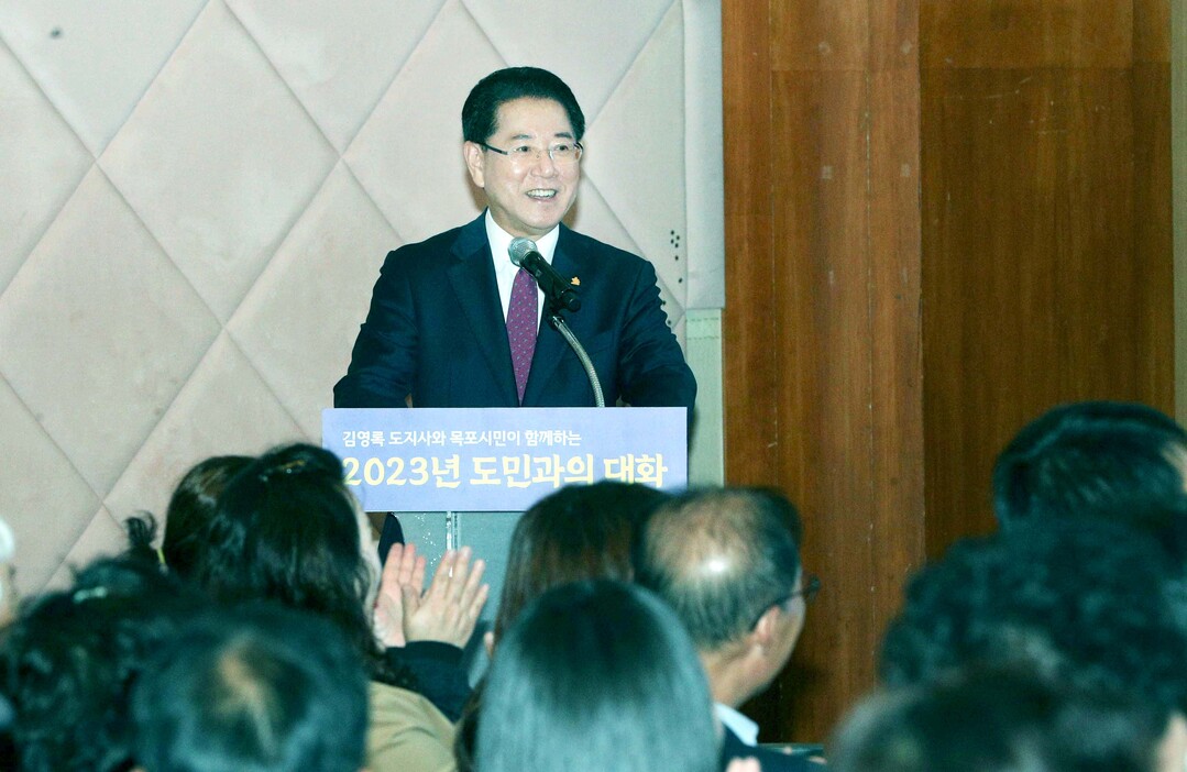 | ▲김영록 전라남도지사가 7일 오후 목포시 죽교동 신안비치호텔에서 열린 2023 목포시 도민과의 대화에서 도정을 소개하고 있다.[목포시 제공] |