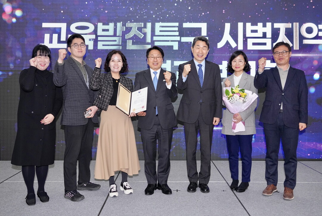 | ▲ 강기정 광주광역시장이 20일 홀리데이인 광주호텔에서 열린 '교육발전특구 시범지역 운영 성과보고회'에 참석해 참석자들과 기념사진을 촬영하고 있다. [광주광역시 제공] |