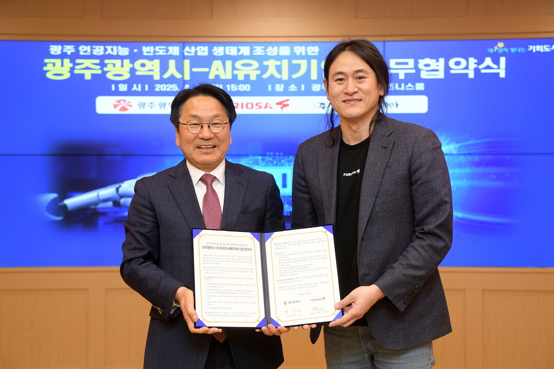 | ▲ 강기정 광주광역시장이 1일 오후 시청 비즈니스룸에서 백준호 ㈜퓨리오사에이아이 대표이사, 윤영태 ㈜이슬림코리아 대표이사와 광주 인공지능·반도체 산업생태계 조성을 위한 업무협약을 체결한 후 기념촬영을 하고 있다. [광주광역시 제공] |