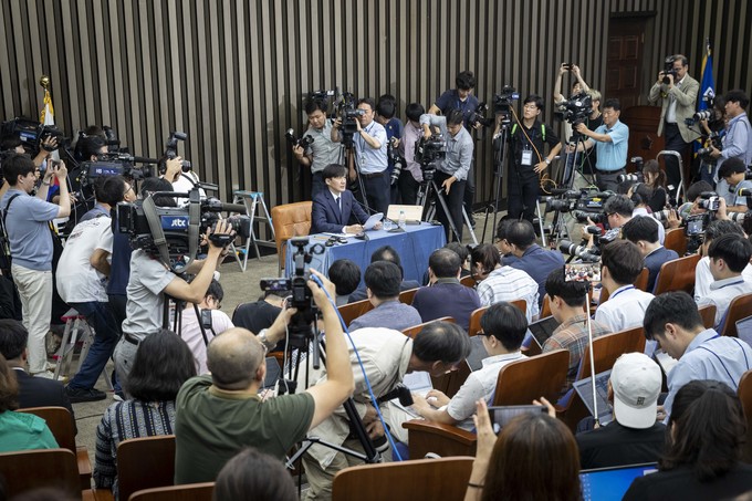 조국 법무부 장관 후보자가 2일 오후 서울 여의도 국회에서 기자회견을 하고 있다.