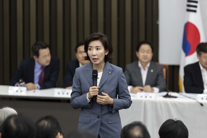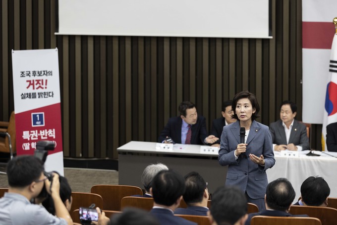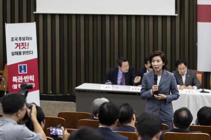 자유한국당 나경원 원내대표가 3일 오후 서울 여의도 국회에서 열린 '조국 후보자의 거짓과 선동, 대국민 고발 언론 간담회'에 참석해 취재진 질문에 답하고 있다.