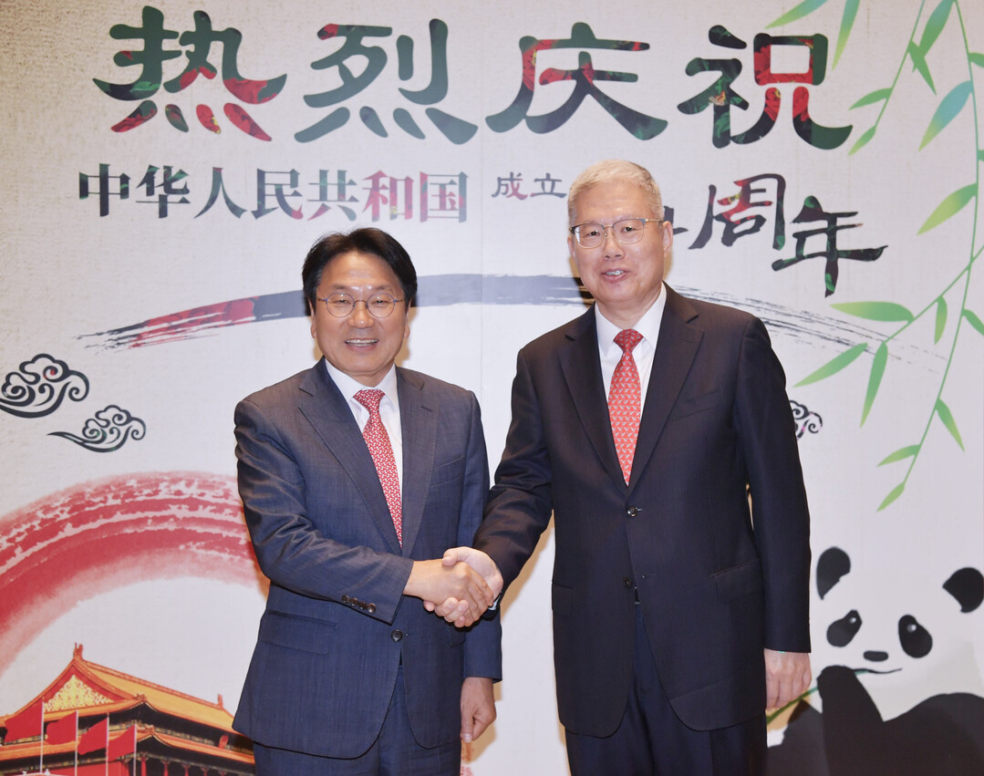 | ▲강기정 광주광역시장이 13일 웨딩그룹 위더스광주에서 열린 '중국 건국 74주년 경축 리셉션'에 참석, 장청강 중국 광주총영사와 기념 촬영을 하고 있다. 강 시장은 "광주는 중국 광저우시와 27년간의 우정을 이어가고 있고 창즈시, 우한시, 선양시 등 여러 도시들과의 협력관계도 견고하다"며 "앞으로 우호협력 범위를 확대하고 분야도 다양화해야 한다"고 강조했다. [광주광역시 제공] |