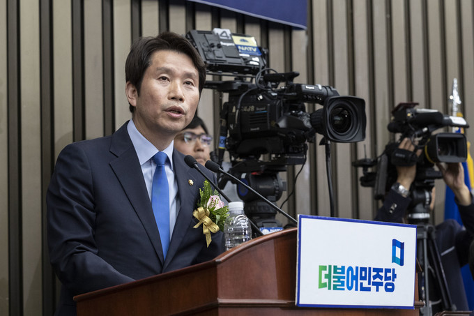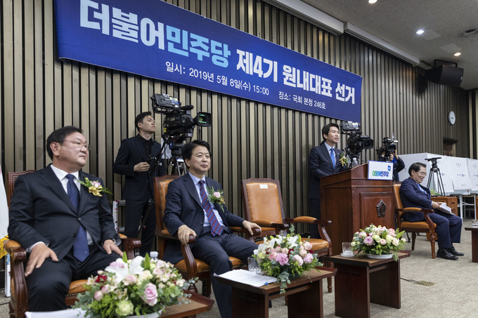 이인영 더불어민주당 원내대표 후보가 8일 오후 서울 여의도 국회에서 열린 더불어민주당 원내대표 선출 정견발표에서 당원들에게 지지를 호소하고 있다. 이 의원은 이날 "우리는 변해야 하고 변해야 승리할 수 있다"고 주장했다. 그러면서 "(나는) 발끝까지도 바꾸려 한다. 정치라는 축구장에서, 레프트 윙에서 옮겨 중앙 미드필더가 되겠다"고 말했다.