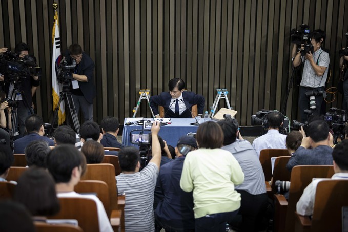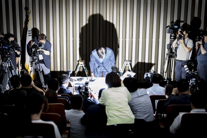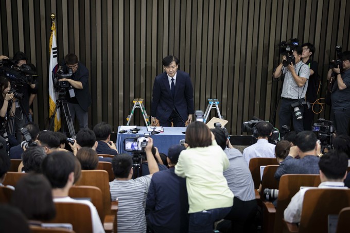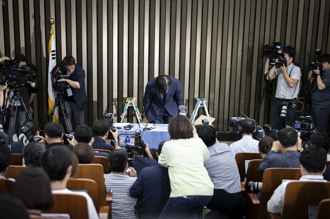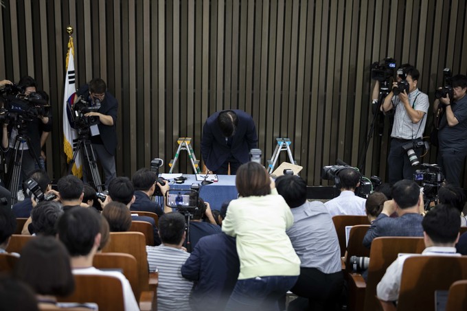 조국 법무부 장관 후보자가 2일 오후 서울 여의도 국회에서 열린 기자회견에 참석, 허리 숙여 사과하고 있다.
