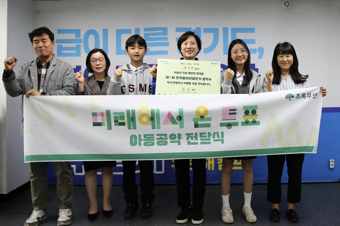 유은혜 경기교육감 예비후보는 20일 선거사무소에서 초록우산 어린이재단 활동가 및 학생 대표단과 만나 '아동 정책 제안서 전달식'을 갖고 "학생을 정책의 대상이 아닌 주체로 세우고, 교육 주체인 학생들과 함께 정책을 만들어 가겠다"고 밝혔다.
