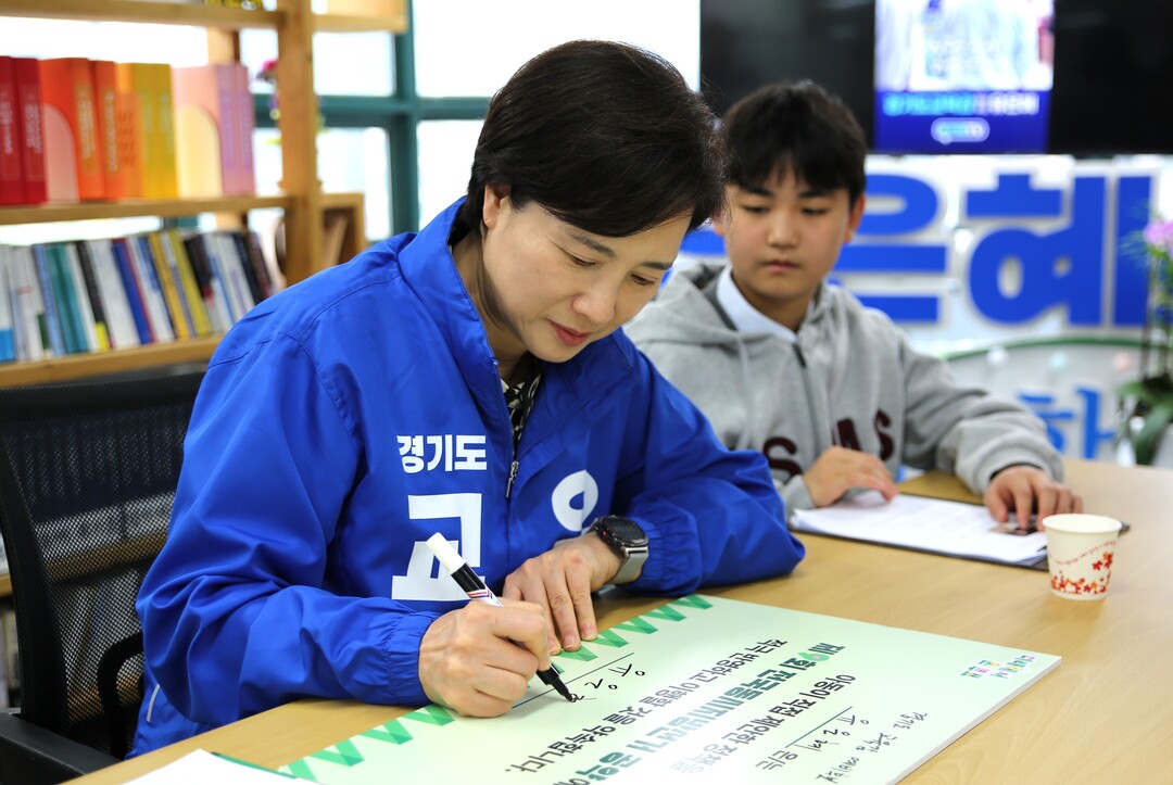 | ▲ 유은혜 경기교육감 예비후보가 20일 아동정책 초록우산 어린이재단 활동가 및 학생 대표단으로부터 아동 정책 제안서를 전달받은 뒤 공약 반영을 약속하며 서명하고 있다. [유은혜 예비후보 캠프 제공] |