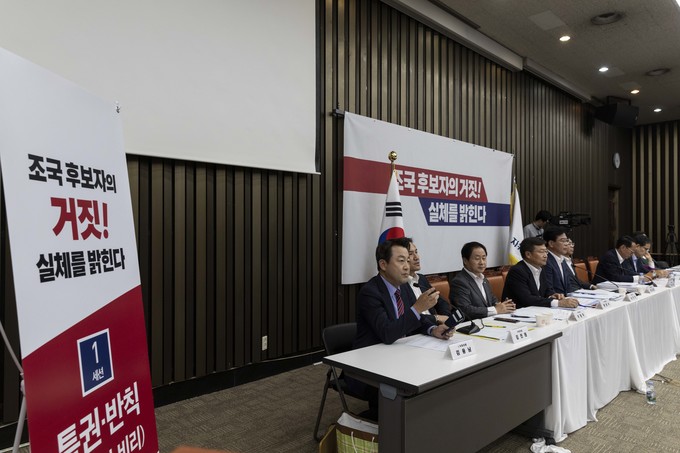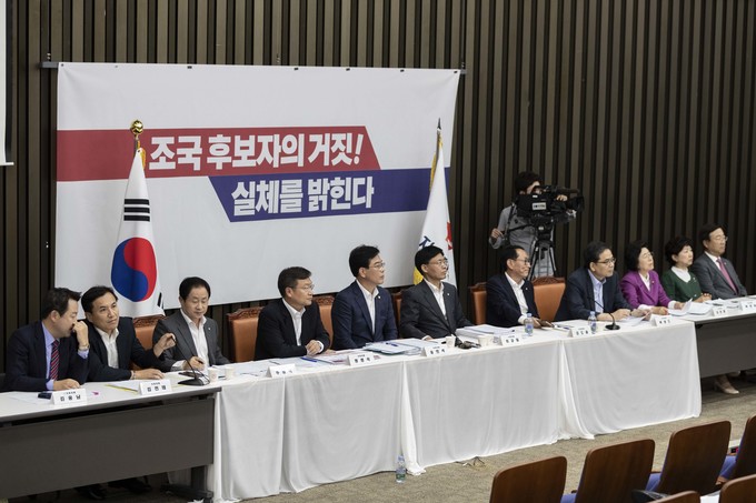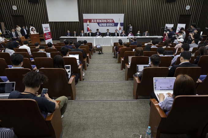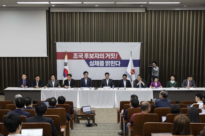 한국당 '조국 후보자의 거짓과 선동, 대국민 고발 언론 간담회'가 3일 오후 서울 여의도 국회에서 열린 가운데 발언을 마친 의원들이 취재진 질문에 답하고 있다.