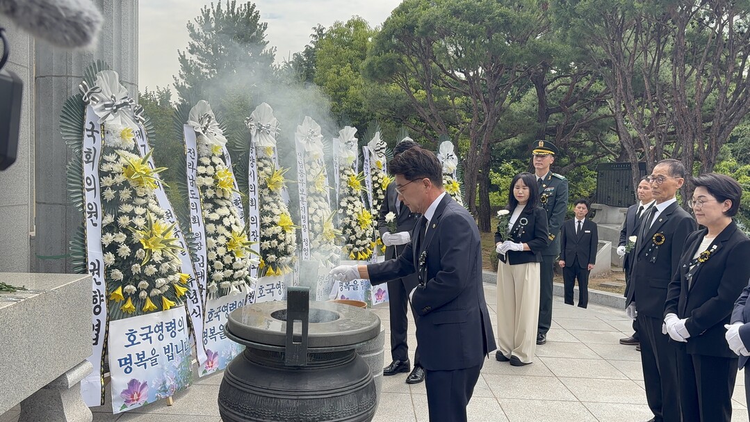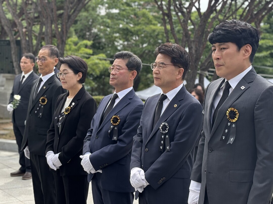 | ▲ 전라남도의회 김태균 의장이 6일 전남 광양시 중동 현충탑 광장에서 거행된 제70회 현충일 추념식에 참석해 순국선열과 호국영령의 넋을 기리고 있다. [전남도의회 제공] |
