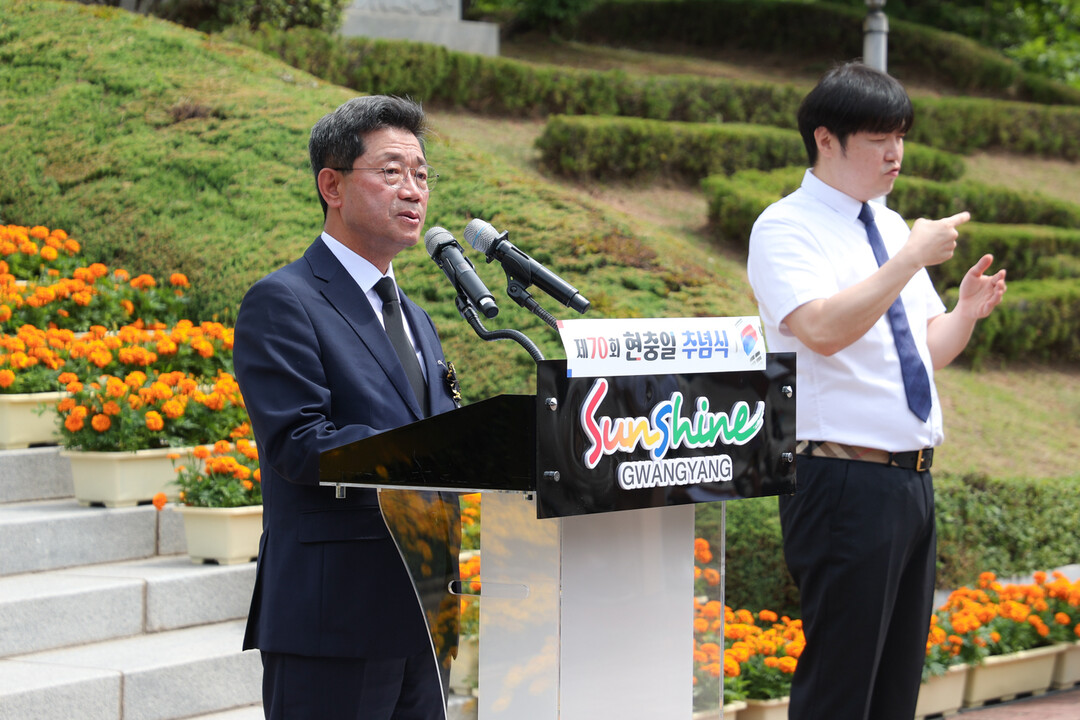 | ▲ 정인화 전남 광양시장이 6일 전남 광양시 중동 현충탑 광장에서 거행된 제70회 현충일 추념식에 참석해 추념사를 낭독하고 있다. [광양시 제공] |