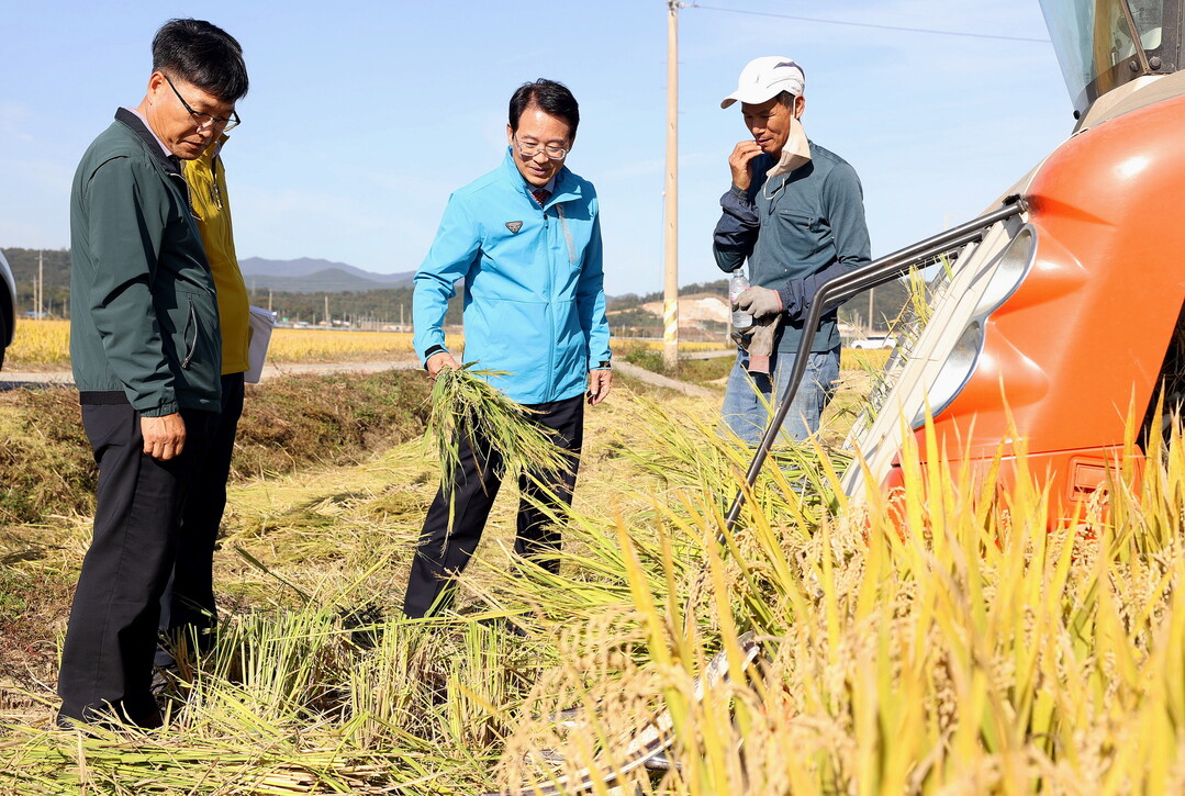 | ▲ 지난 18일 강진원 강진군수가 영농현장을 찾아 수확한 벼를 만지며 농업인의 애로사항을 청취하고 있다. [강진군 제공] |