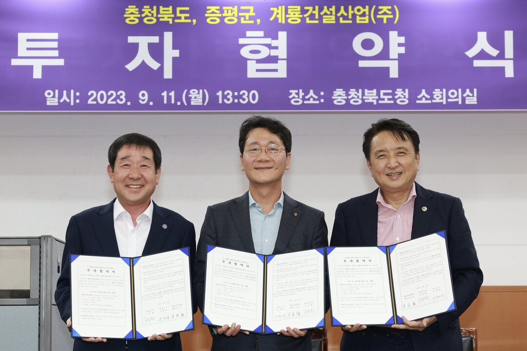 충북도와 증평군은 11일 도청 소회의실에서 사업시행자인 계룡건설산업이 참여한 가운데 증평3 산업단지 성공적 조성을 위한 투자협약을 맺었다.