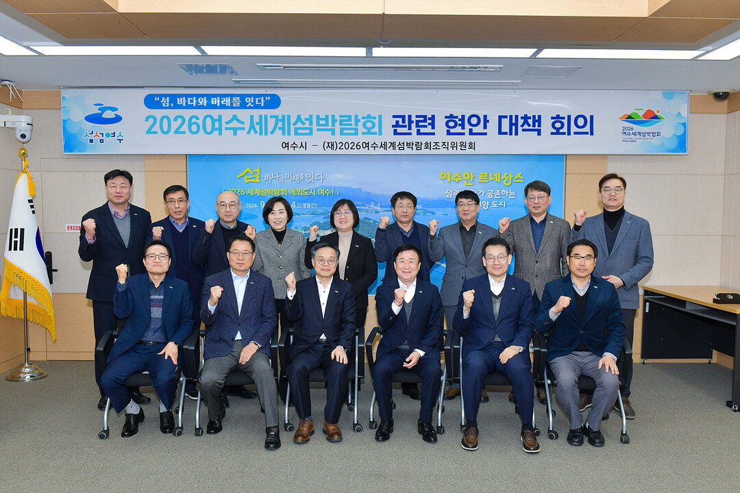 | ▲ 정기명 전남 여수시장이 19일 (재)2026여수세계섬박람회 조직위원회와 대책 회의를 연 뒤 기념촬영을 하고 있다. [여수시 제공] |