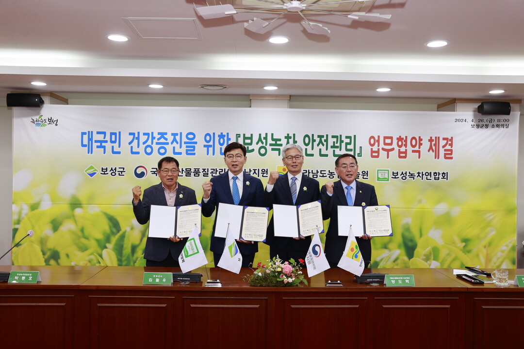 전남 보성군과 국립농산물품질관리원 전남지원이 26일 전남 농업기술원, 보성녹차연합회와 함께 대국민 건강 증진을 위한 '보성녹차 안전관리' 업무 협약을 체결했다.