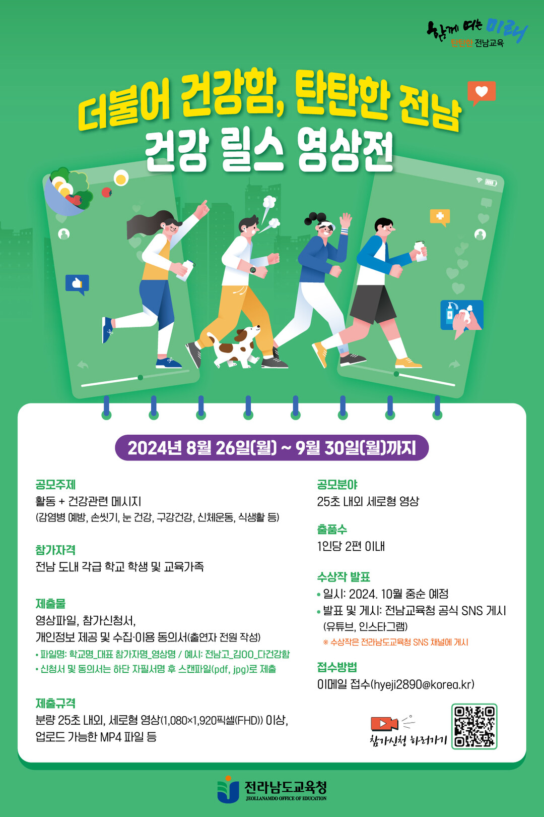 전라남도교육청이 '더불어 건강함, 탄탄한 전남' 건강 릴스 영상공모전을 26일부터 다음달 30일까지 접수한다.