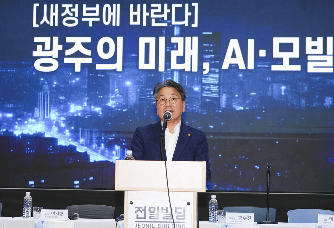 | ▲ 강기정 광주광역시장이 8일 오후 동구 전일빌딩245에서 열린 '광주의 미래, AI모빌리티 정책포럼'에 참석해 축사를 하고 있다. [광주광역시 제공] |