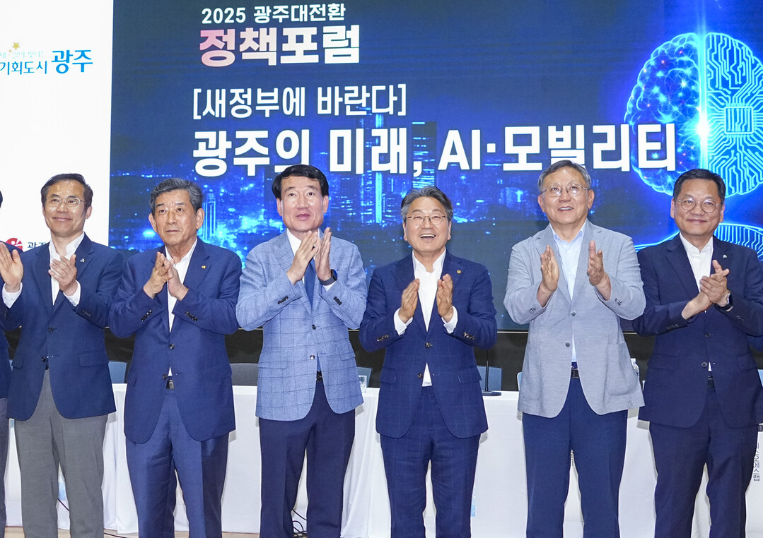 | ▲ 강기정 광주광역시장이 8일 오후 동구 전일빌딩245에서 열린 '광주의 미래, AI모빌리티 정책포럼'에 참석해 내빈들과 기념촬영을 하고 있다. [광주광역시 제공] |