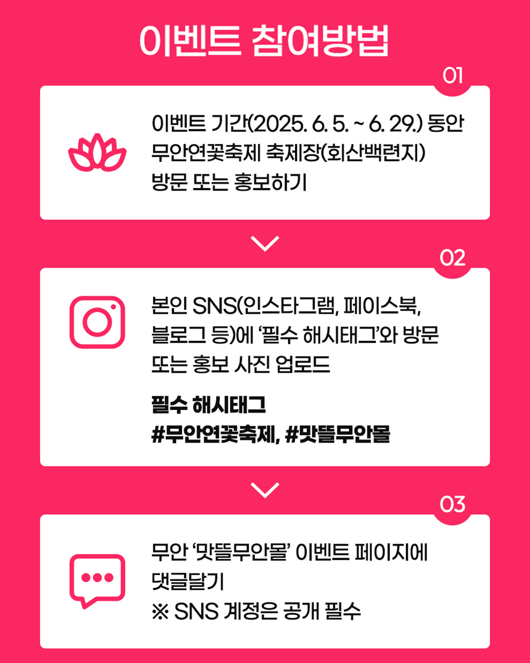 참여 방법은 이벤트 기간에 회산백련지 축제장을 방문해 인증샷을 찍거나 무안군 공식 SNS에 게시된 축제 홍보 게시물을 공유한 뒤, 개인 SNS에 필수 해시태그(#무안연꽃축제, #맛뜰무안몰)를 포함해 게시해 맛뜰무안몰 이벤트 페이지에 댓글을 작성하면 된다.