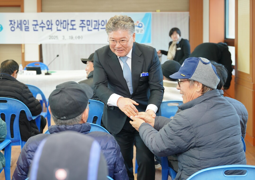 | ▲ 장세일 전남 영광군수가 19일 2025 '찾아가는 낙월면민과의 대화'를 위해 안마도와 송이도를 방문해 주민 의견을 청취하기 전 주민과 인사를 하고 있다. [영광군 제공] |