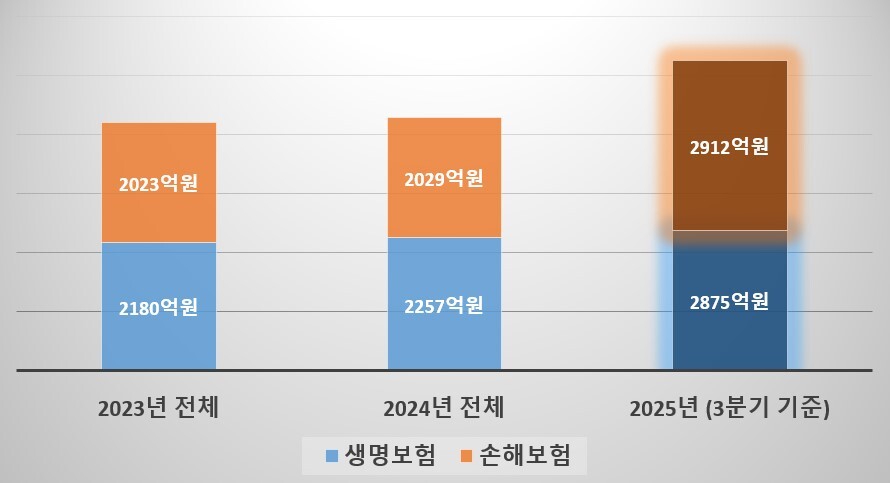 생명보험보다 손해보험 증가세가 더 컸다. 생명보험사의 채권 이자비용은 2025년 3분기 누적 2378억 원으로 전년 동기(1596억 원) 대비 48.9% 늘었다. 손해보험사는 같은 기간 1402억 원에서 2875억 원으로 105.1% 급증했다.