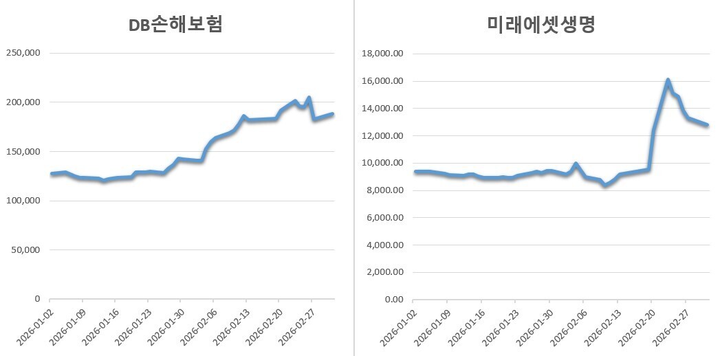 | ▲ 연초 이후 DB손해보험 및 미래에셋생명 주가 추이. [한국거래소 정보데이터시스템] |