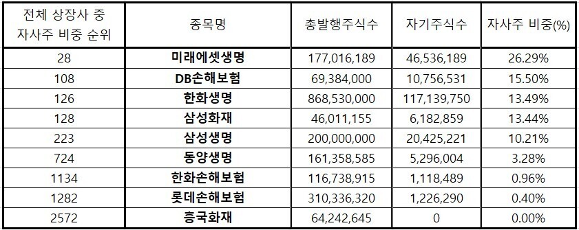 | ▲ 상장 보험사 자사주 보유 비중 현황. [한국거래소 정보데이터시스템] |