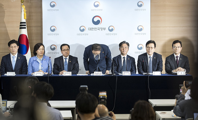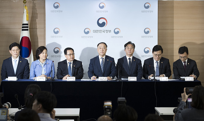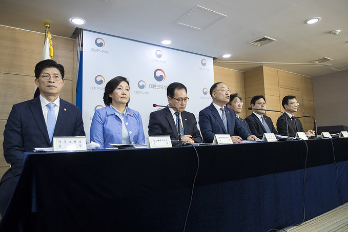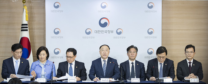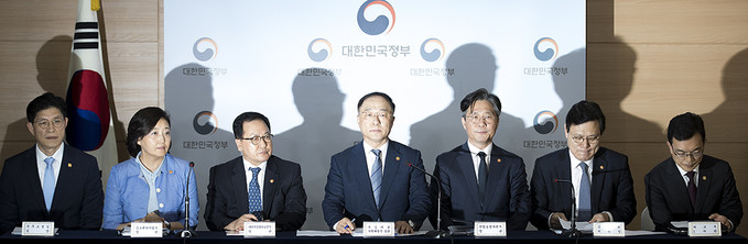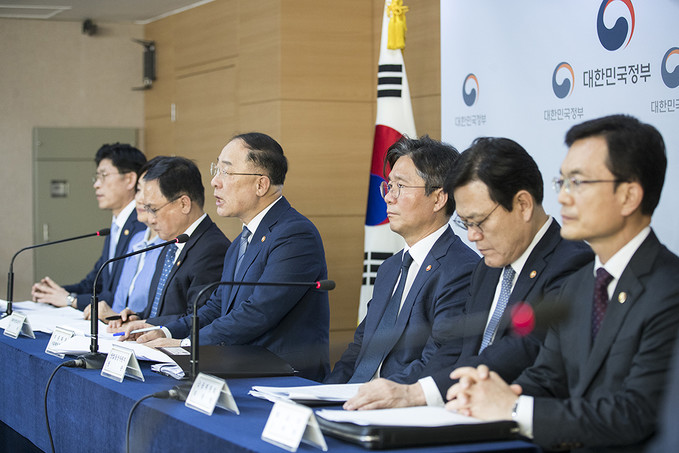 홍남기 경제부총리 겸 기획재정부 장관이 2일 오후 서울 종로구 정부서울청사에서 '일본 정부의 백색국가 배제 등 수출규제 및 보복조치 관련' 브리핑을 하고 있다. 왼쪽부터 노형욱 국무조정실장, 박영선 중소벤처기업부 장관, 유영민 과학기술정보통신부 장관, 홍남기 부총리 겸 기획재정부 장관, 성윤모 산업통상자원부 장관, 최종구 금융위원장, 조세영 외교부 1차관.