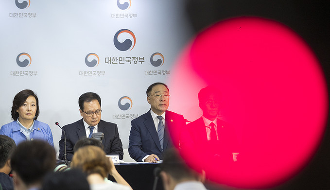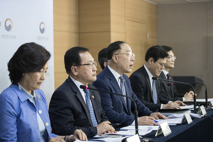 홍남기 경제부총리 겸 기획재정부 장관이 2일 오후 서울 종로구 정부서울청사에서 '일본 정부의 백색국가 배제 등 수출규제 및 보복조치 관련' 브리핑을 하고 있다. 왼쪽부터 박영선 중소벤처기업부 장관, 유영민 과학기술정보통신부 장관, 홍남기 부총리 겸 기획재정부 장관, 성윤모 산업통상자원부 장관, 최종구 금융위원장, 조세영 외교부 1차관.