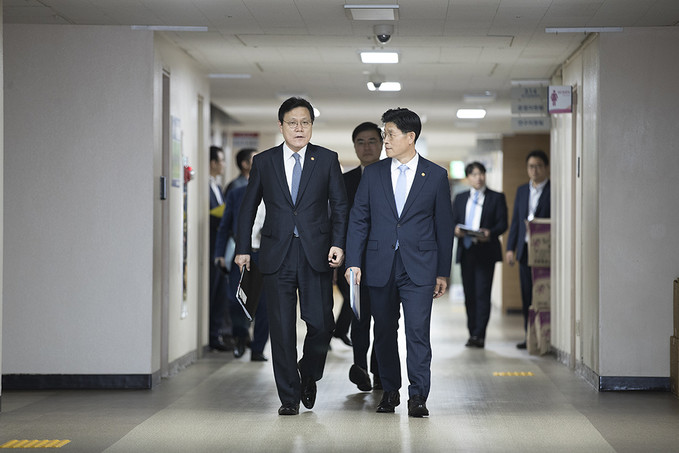 최종구 금융위원장과 노형욱 국무조정실장이 2일 오후 서울 종로구 정부서울청사에서 '일본 정부의 백색국가 배제 등 수출규제 및 보복조치 관련' 브리핑에 참석하기 위해 회의실로 들어오고 있다.