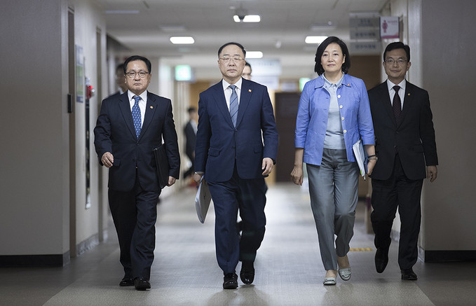 홍남기(가운데) 경제부총리 겸 기획재정부 장관 등 관계부처 장관들이 2일 오후 서울 종로구 정부서울청사에서 '일본 정부의 백색국가 배제 등 수출규제 및 보복조치 관련' 브리핑에 참석하기 위해 회의실로 들어오고 있다.