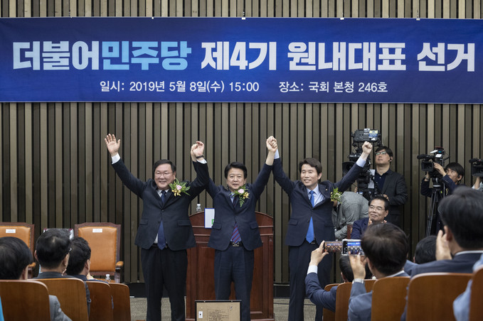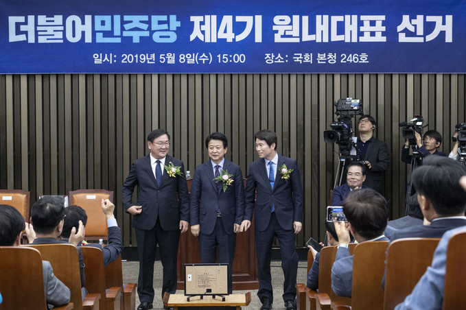 김태년, 노웅래, 이인영 후보가 8일 국회에서 열린 더불어민주당 제4기 원내대표 선출을 위한 의원총회에서 정견발표를 마치고 기념촬영을 하고 있다.
