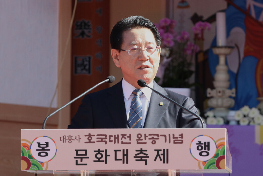 | ▲ 김영록 전라남도지사가 2일 오전 해남 대흥사에서 개최된 "2024 대흥사 호국대전 완공기념 문화대축제"에 참석한 뒤 환영사를 하고 있다. [전남도 제공] |