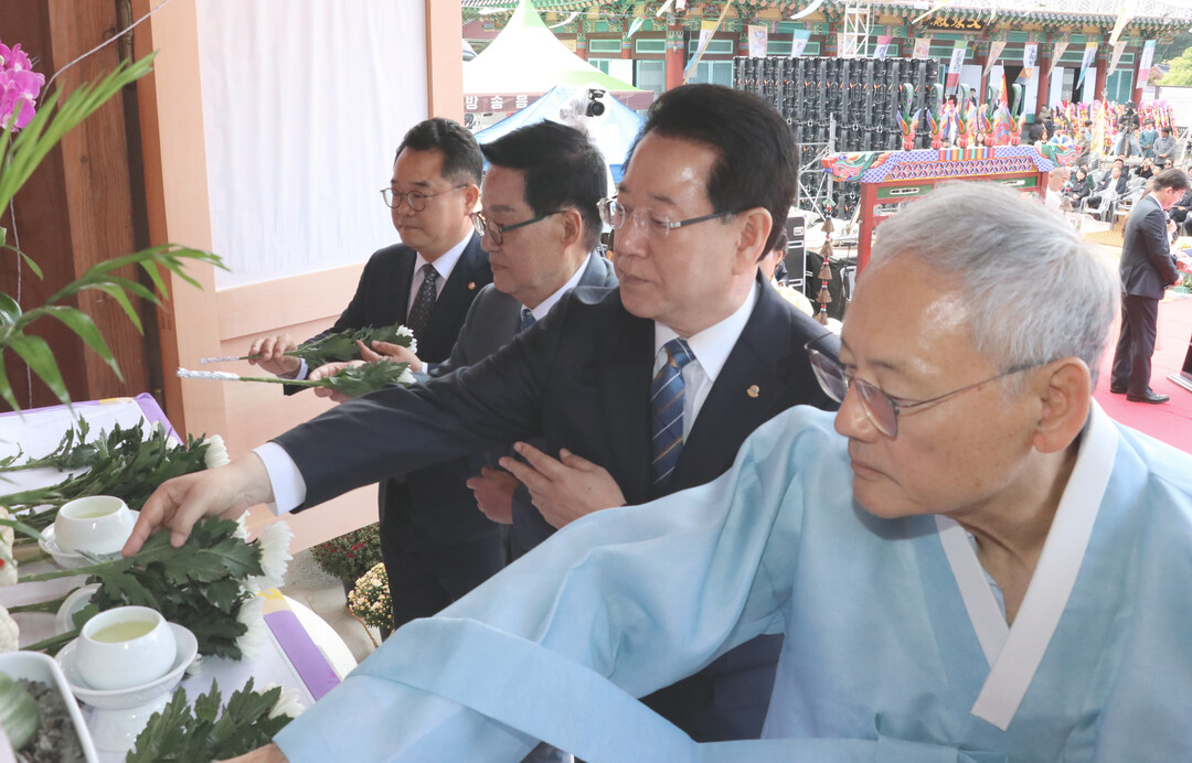 | ▲ 2일 오전 김영록 전라남도지사를 비롯한 유인촌 문화체육관광부장관, 박지원 국회의원, 민병덕 국회의원이 해남 대흥사에서 개최된 '2024 대흥사 호국대전 완공기념 문화대축제'에 참석한 뒤 헌화를 하고 있다. [전남도 제공] |